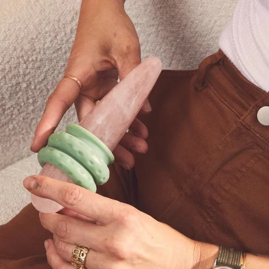 It comes with up to four rings. Depending on your need, you can change the number of rings around the shaft. So maybe one day, someone needs all four because they are experiencing pelvic pain, and any penetration is starting to feel too uncomfortable. Or perhaps as they relax more and feel more aroused, they can handle being more deeply penetrated, then they can pull three off and only stick with one. So, there's a lot of wiggle room with how many to use, which is a great tool.